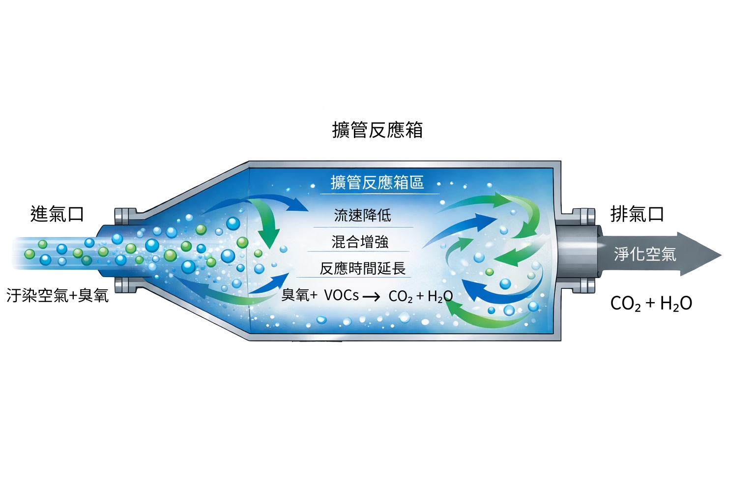 2. 擴管反應箱 : 將風管設計成「管徑由小變大」或「進出口管徑不同」 的反應空間,讓氣體或氣液混合流體在進入較大截面後以便:流速降低 / 停留時間增加 / 擾流與混合效果提升反應更充分